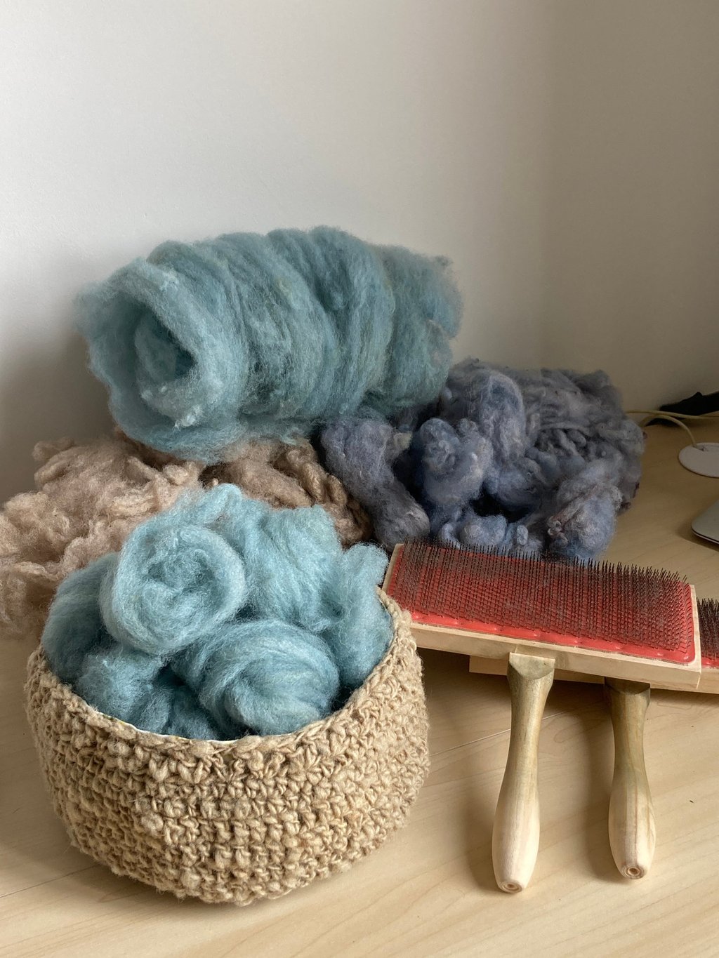 ... je carde avec des brosses ou ma cardeuse à rouleau...